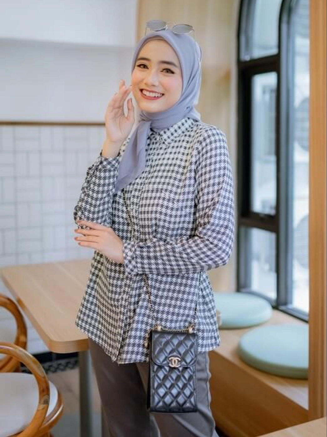 Tak harus longgar, atasan blouse kotak-kotak dengan model fit-in di badan juga banyak disukai. Motif kotaknya super kecil dan membuatnya blouse ini tidak pasaran. Cutting bagian pinggang dibuat ramping dan bagian bawahnya lebih lebar, sehingga menciptakan ilusi slim.